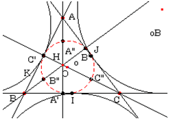 九点円とフォイエルバッハの定理の図を作図したものです。CabriUPlusは紙に描くと煩雑になってどれが何を表すのか分からないような図も簡単に作図でき,しかも性質を保ったまま動かすことができます。 |